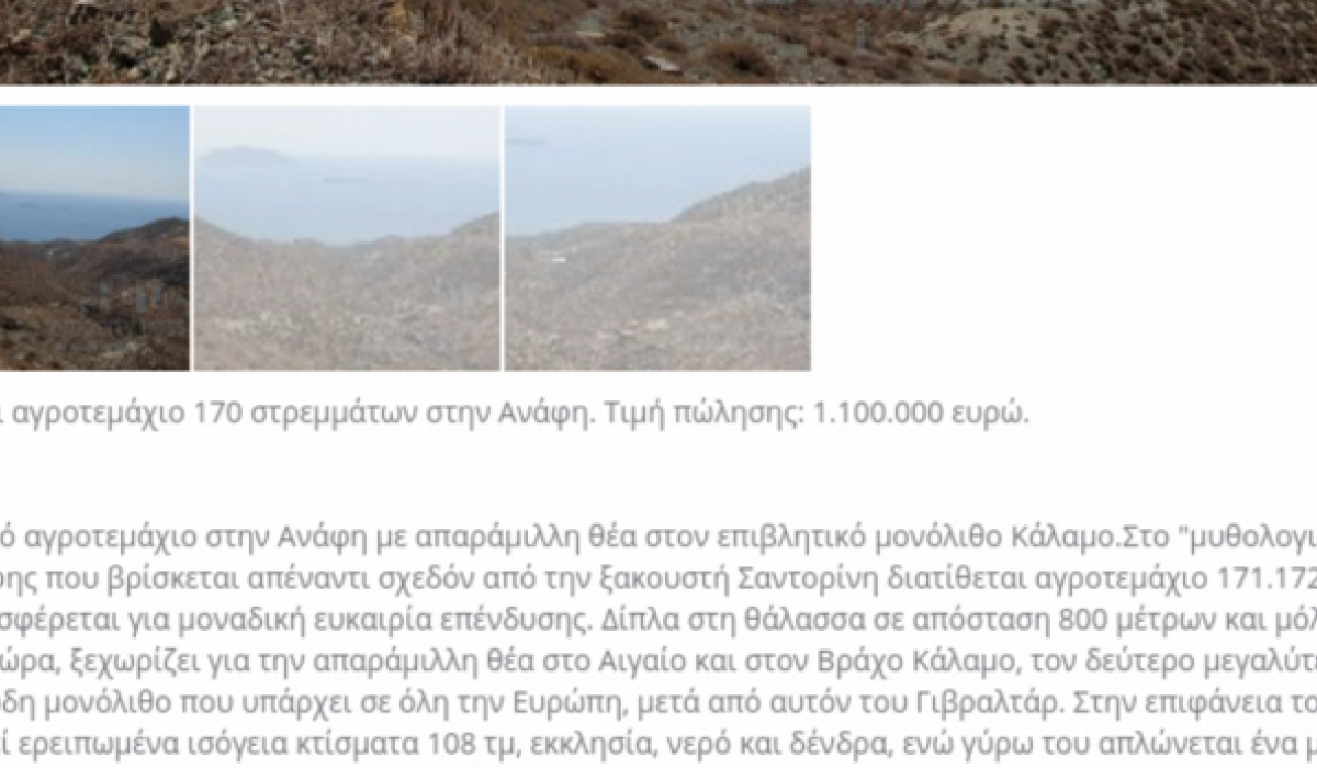 Πωλείται αγροτεμάχιο 170 στρεμμάτων στην Ανάφη. Τιμή πώλησης: 1.100.000 ευρώ.